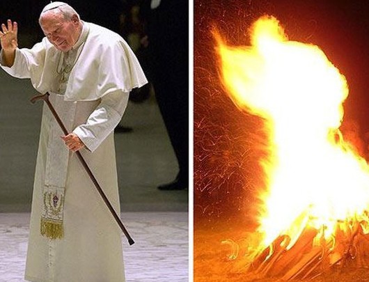 在英国威尔特郡迪韦齐斯地区的一片大麦田中,出现了一个400英尺(约合121.9米)长的凤凰形状麦田怪圈。一位麦田怪圈研究专家认为,凤凰是富有神话色彩的,在许多国家都代表着重生和新时代的到来,这个怪圈可能和玛雅预言不谋而合。 波兰在守夜纪念教皇约翰保罗二世去世两周年。业余摄影师格热戈日拍摄的篝火显现出类似约翰保罗二世的剪影,数码图片的时间21.37:30 ,正与教皇去世的时间相吻合。